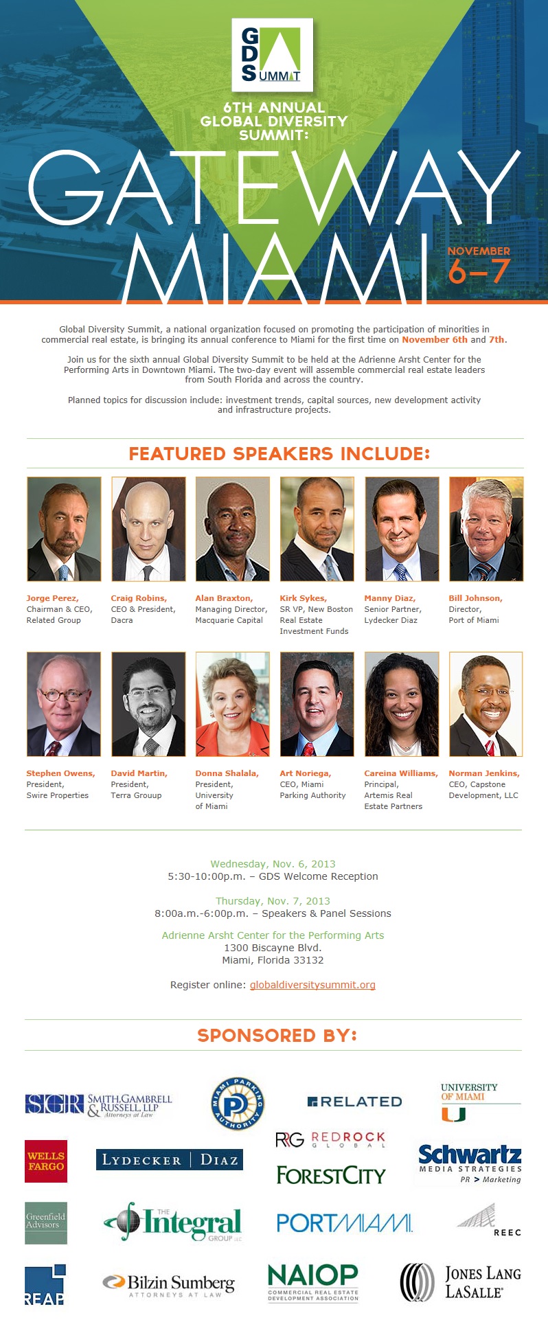 Sponsors of this year’s Global Diversity Summit include: Smith Gambrell & Russell LLP, Miami Parking Authority, Related Group, University of Miami, Wells Fargo, Lydecker Diaz, Red Rock Global, Schwartz Media Strategies, Jones Lang LaSalle, ForestCity, Greenfield Advisors, The Integral Group, NAIOP, PortMiami, Real Estate Executive Council (REEC), Bilzin Sumberg Baena Price & Axelrod LLP, and REAP.